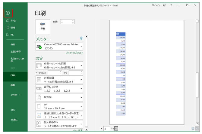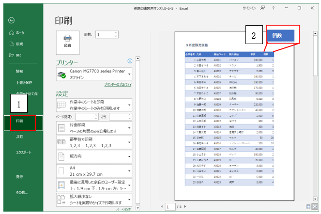 ‘③「印刷」をクリックすると、右側にプレビューが表示され、右端列が個数と表示していることがわかります。