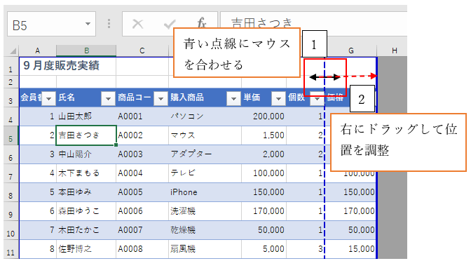 ‘⑧青い点線にマウスポインタ―を合わせ、マウスポインタ―の形の表示「↔」が変わったら、青い点線をドラッグして位置を調整します。