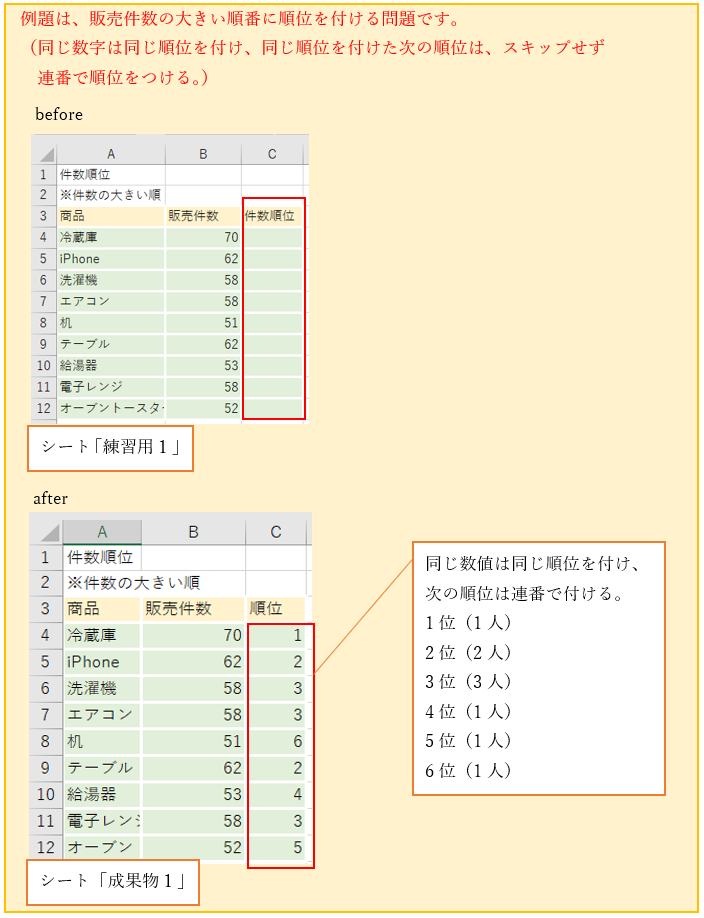 (練習で実施する「同順位を飛ばさずに連番で順位を求める」の完成図)