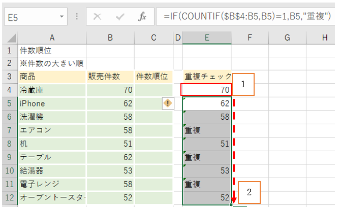 ‘①まず、セルE4を選択し、数式「=IF(COUNTIF($B$4:B4,B4)=1,B4,”重複”)」と入力します。すると、70と表示されます。