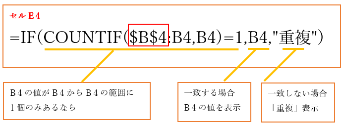・COUNTIF(条件式)=1とならない為、論理式に一致しない場合の値「重複」が表示されます。