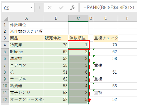 これで、E列に、1位からの連番順位で表示され、同順位が下の行に見つかった場合は、重複と表示されていることがわかります。