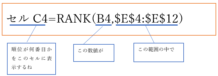 ‘③セルC4を選択し、数式「=RANK(B4,$E$4:$E$12)」を入力します。すると、1と表示されました。