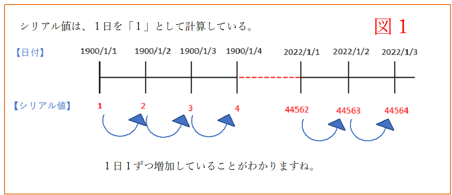Excelの内部では、日付は、1900年1月1日を「1」として、1日ずつ増える仕組みで管理しています。この数値のことをシリアル値と呼びます。 数値で管理していることにより、日付の足し算や引き算も可能となります。
