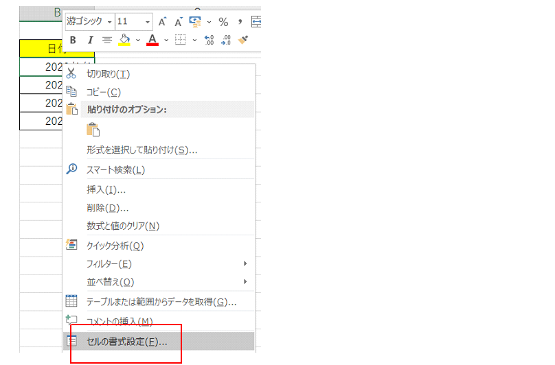 ②選択したセルの上で、マウス右クリックし、セルの書式設定を選択する