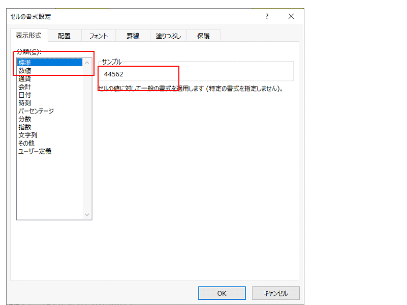 するとサンプルにシリアル値の44562が表示される。これがシリアル値である。