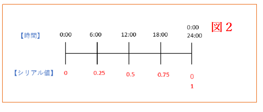 Excelの時刻では、1日24時間を「1」としてシリアス値を計算しています。そのため、12時は、半分の「0.5」である。朝の6時は、12時の半分で「0.25」である。図2に簡単な時刻とシリアル値の関係を示した図を載せているので、確認しイメージをもっておいてほしい。
