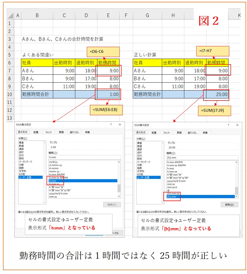 「h:mm」の場合は、図2の左図では、どのように計算しているかと言うと