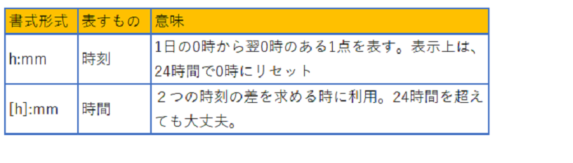 さらに詳しく見ていきます。図2の左と右を比べて何が違うかを見ていくとセルの書式設定が微妙に異なることがわかります。左図は、表示形式が「h:mm」となっており、右図は、「[h]:mm」となっています。Excel標準設定では、「h:mm」となっています。2つの違いと意味は、以下となっているので押さえておいてください。