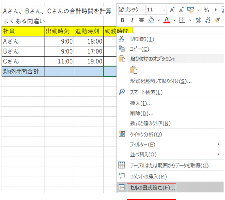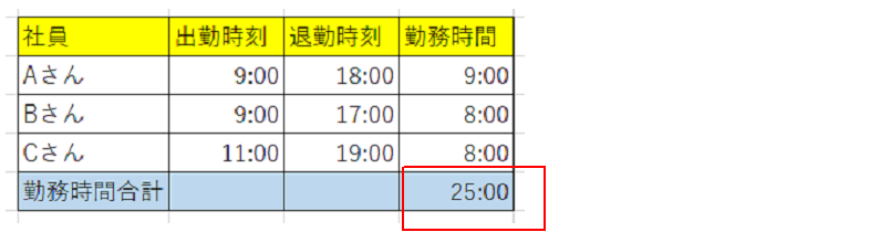 勤務時間合計のセルが、24時間以降の数字を表示することできないことが原因であるから、24時間以降の数字を表示できるようにする。