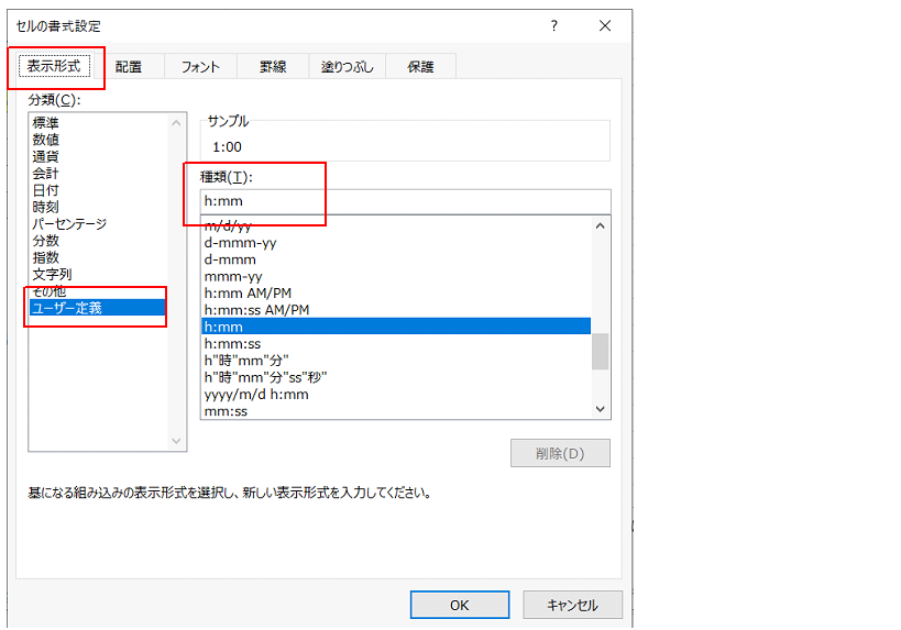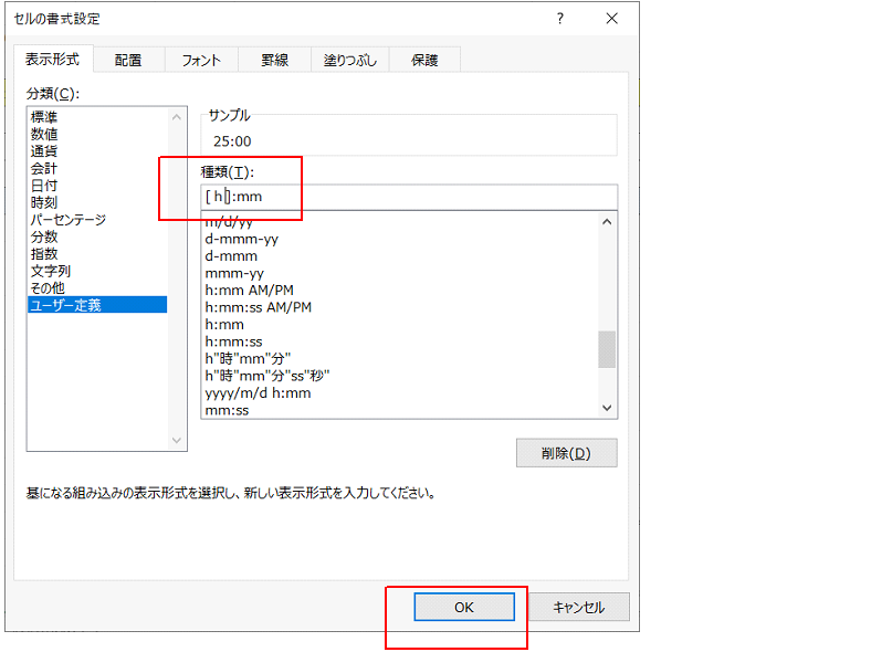 ④ 「h:mm」を「[h]mm」に修正し、OKをクリック。