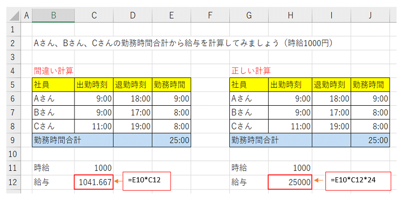 そのため、正しく時給を計算するには、シリアル値を24倍にしてあげて、時給を掛けると正しく計算されます。