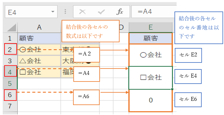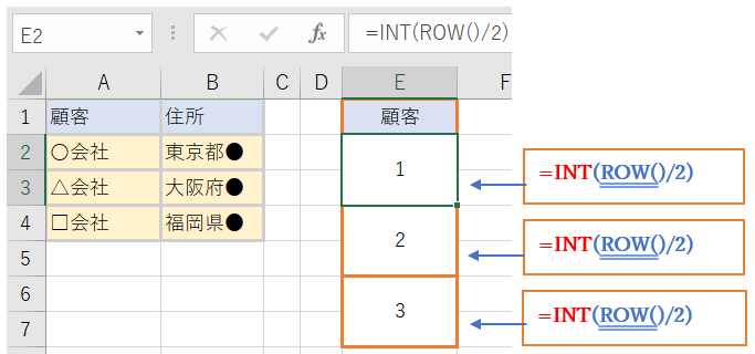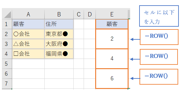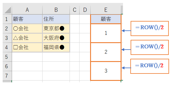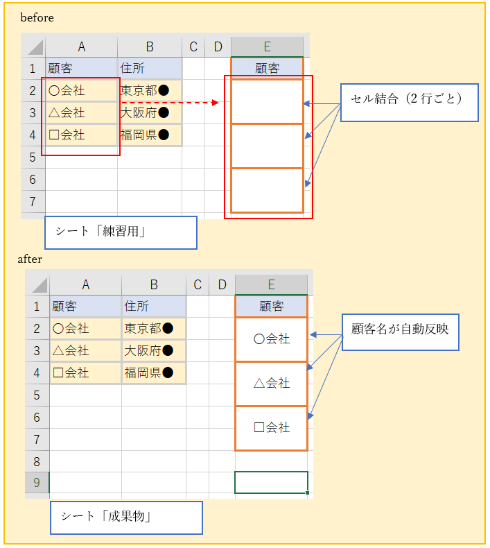 作成するものE列の結合(2行)されたセルに、A列の顧客を上から順番に表示させる問題です。