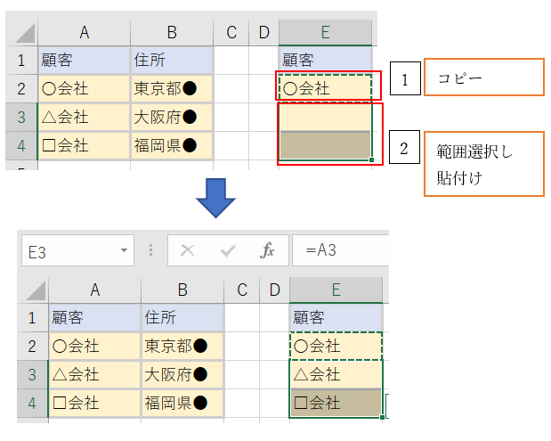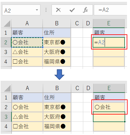 ‘①セルE2に「=A2」と入力し、ENTERキーを押します。