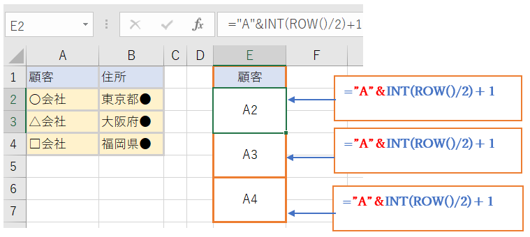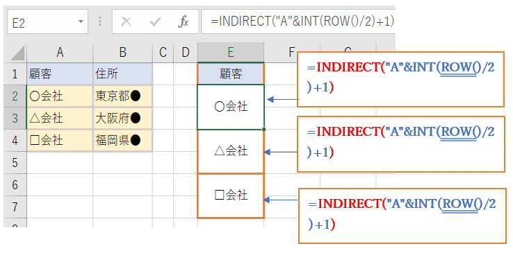‘①セルE2を選択し、数式「=INDIRECT(“A”&INT(ROW()/2)+1)」を入力します。