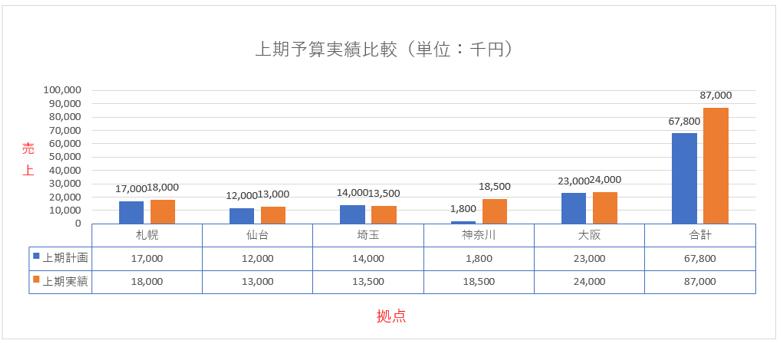さきほどの表の元データをもとに、グラフを作成することができます。また、レイアウトや、デザイン、様々な見せ方ができます。数値を変更すると自動的にグラフにも反映されます。