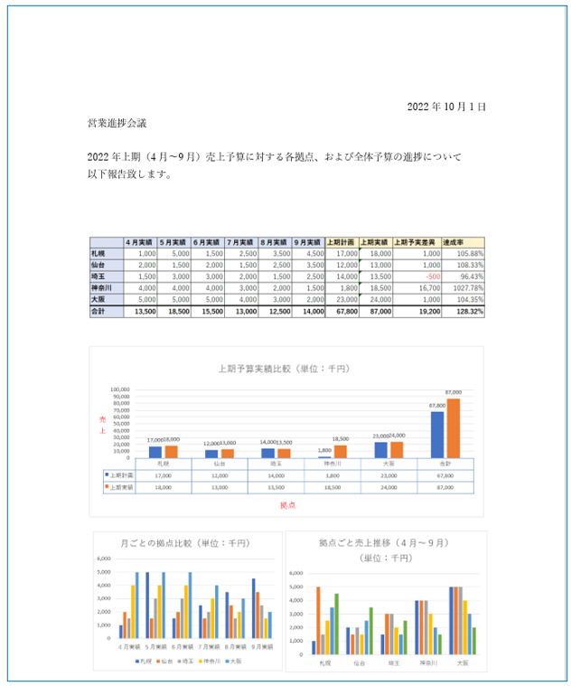 作成した表のデータから、WordやPowerPointにグラフを貼付けて、以下のような報告資料を作成することができます。