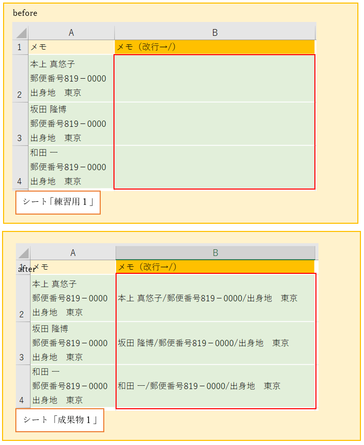 (練習で実施する「セル内改行を「/」に置換する」の完成図)