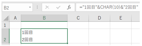セルB2に数式「=”1回目”&CHAR(10)&”2回目”」と入力すると、1回目の後ろで