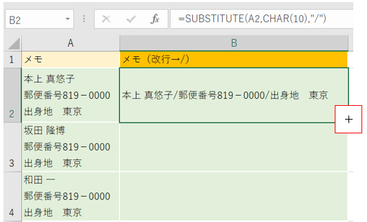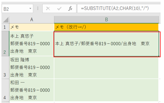 ‘①セルB2を選択し数式「=SUBSTITUTE(A2,CHAR(10),”/”)」を入力してください。