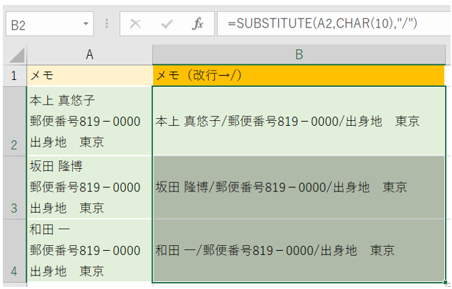 ‘(1)SUBSTITUTE関数とCHAR関数を使ってセル内容改行を「/」に変換します。
