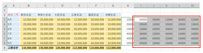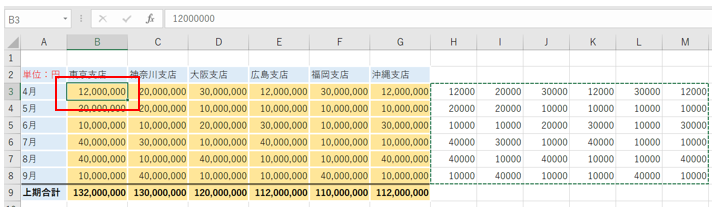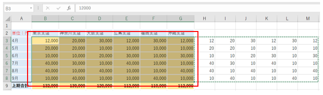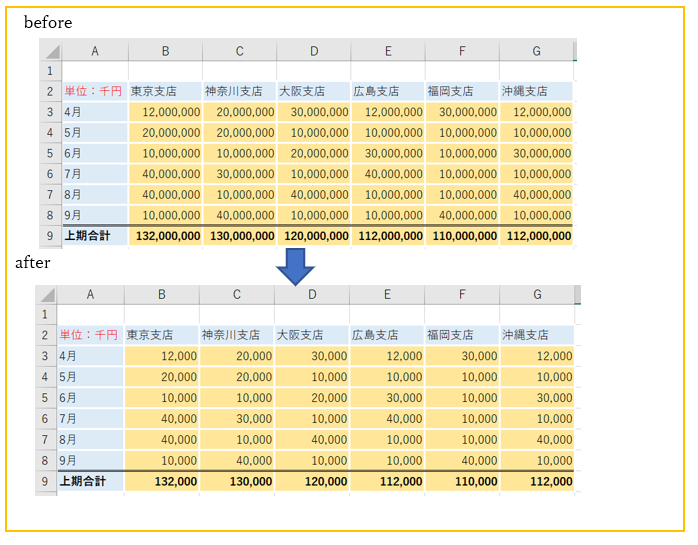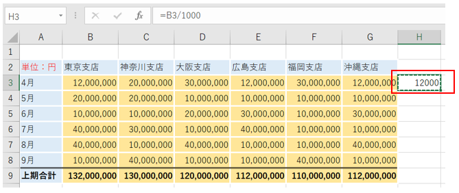 表の元データの数値を1000で割って、円単位の表を千円単位の表に作り直していきたいと思います。