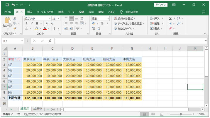 練習サンプルデータは、ダウンロードファイルのシート「練習用」となります。
