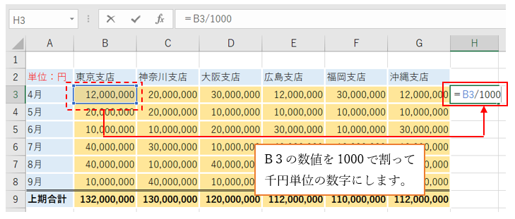 ‘②セルH3を選択して、「=B3/1000」を入力してください。