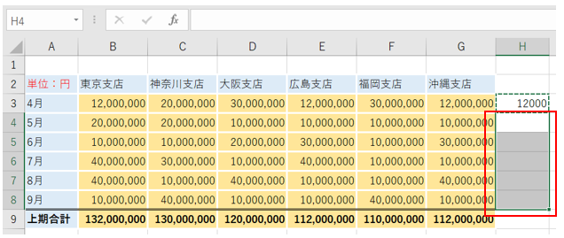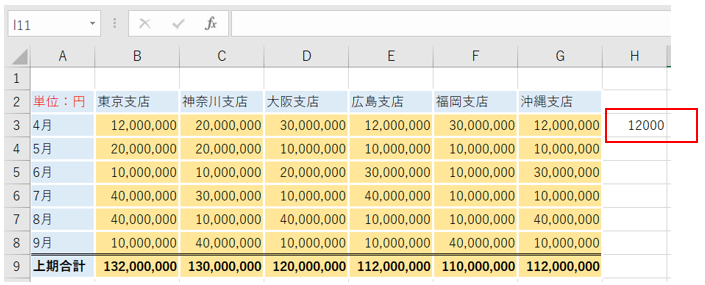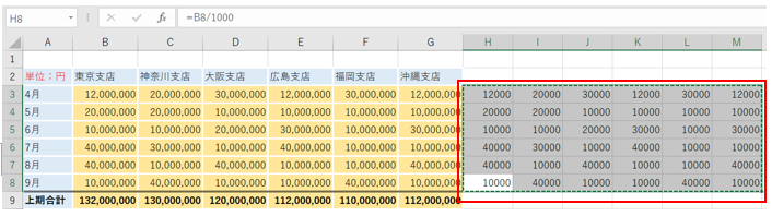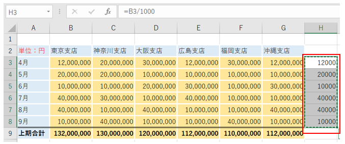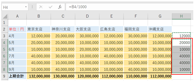すると、セルH4からH8までの数字が1000で割られました。