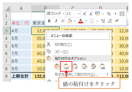 ‘⑭B3を選択した状態で、マウス右クリックし、「値の貼付け」をクリックしてください。