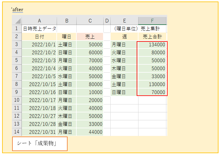 例題は、日時売上データから、曜日ごとの売上合計をF列に集計する問題です。
