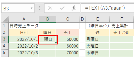 TEXT関数は、セルに入力されている数値を好みの表示形式の文字列に変換できる関数です。この特性を使うことで、日付から曜日を表示させることができます。曜日がわかれば、あとは、SUMIFS関数を使って集計することができます。