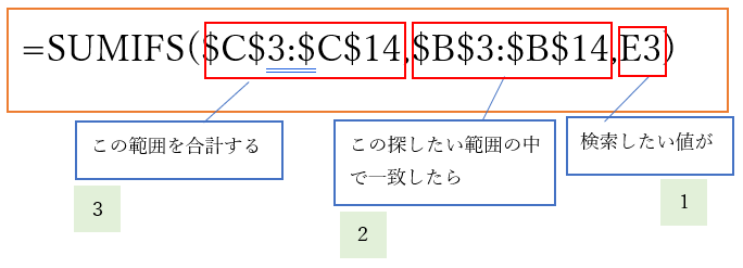 セルF3を選択しましょう。そして数式「=SUMIFS($C$3:$C$14,$B$3:$B$14,E3)」を入力します。すると、「134000」の数字が返ってきます。