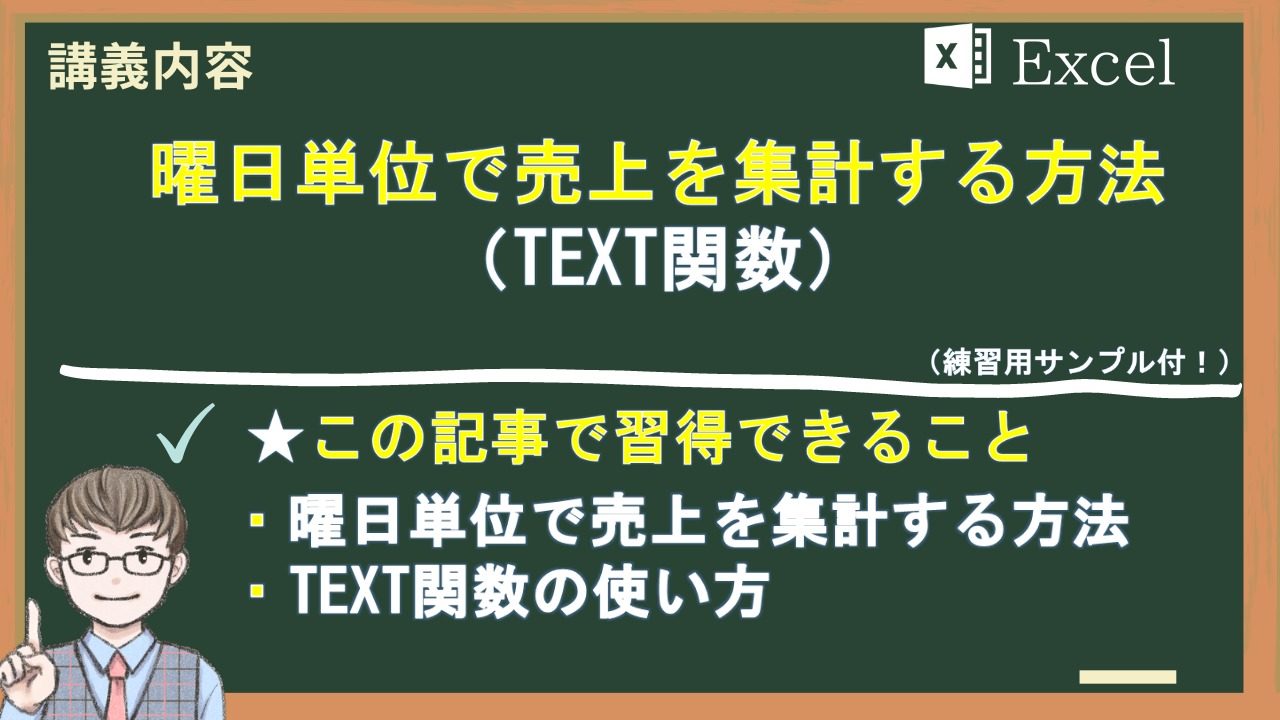 TEXT関数は、セルに入力されている数値を好みの表示形式の文字列に変換できる関数です。この特性を使うことで、日付から曜日を表示させることができます。曜日がわかれば、あとは、SUMIFS関数を使って集計することができます。