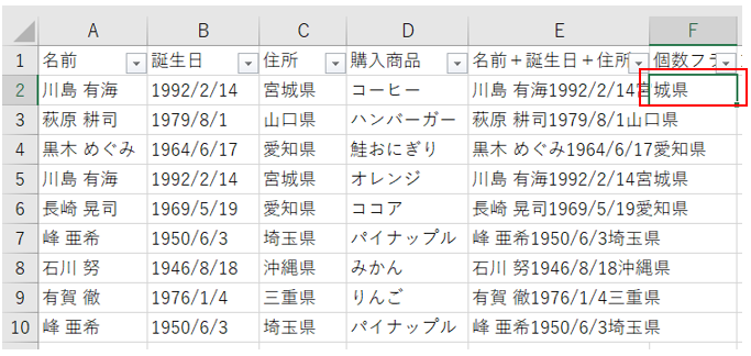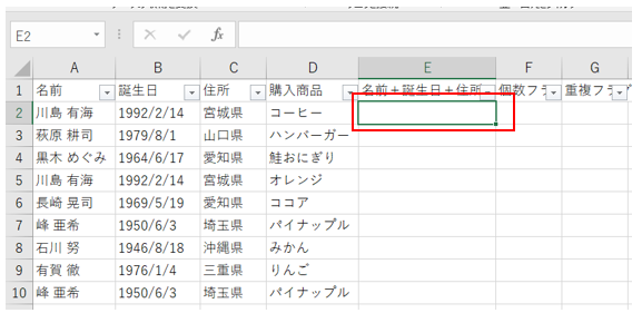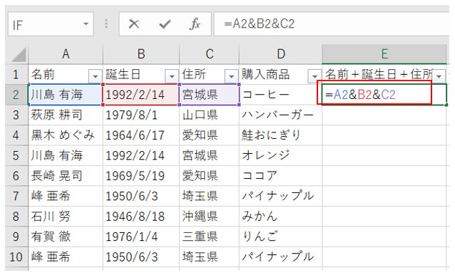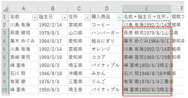 E列に名前と誕生日と住所を結合します。