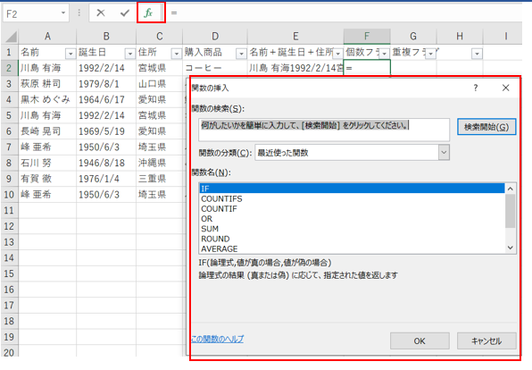 ‘②fxをクリックして、関数の挿入のダイアログボックスを起動します。