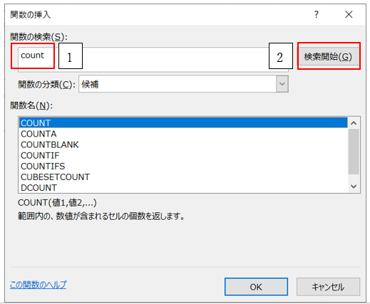 ‘③関数の検索のボックスに、「count」と入力して、「検索開始」を押します。