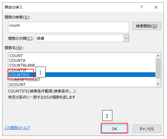 ‘④その中から、COUNTIFSを選択してOKしてください。