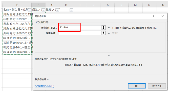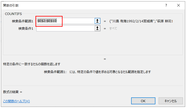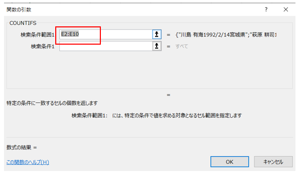 ‘⑤COUNTIFSのダイアログボックスが開いたら、検索条件範囲1に、E2:E10を入力してください。(マウスでE2からE10までをドラッグして選択するも可)