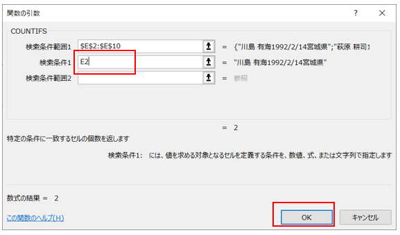 ※まず、E2の情報がE列内に何個存在するかを計算していきます。