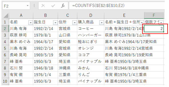 E列の情報が、E列内で何個存在しているかをF列に計算します。