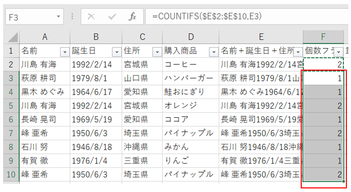 するとF列に、E列の同じ内容が、何個あるかの個数が表示されました。