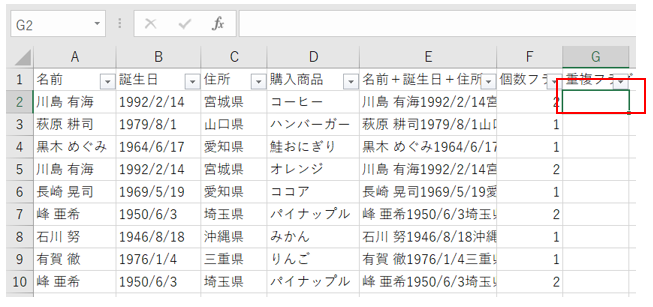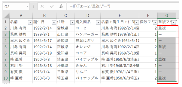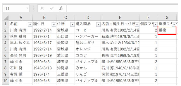 すると、G列全体に重複フラグが立ちました。