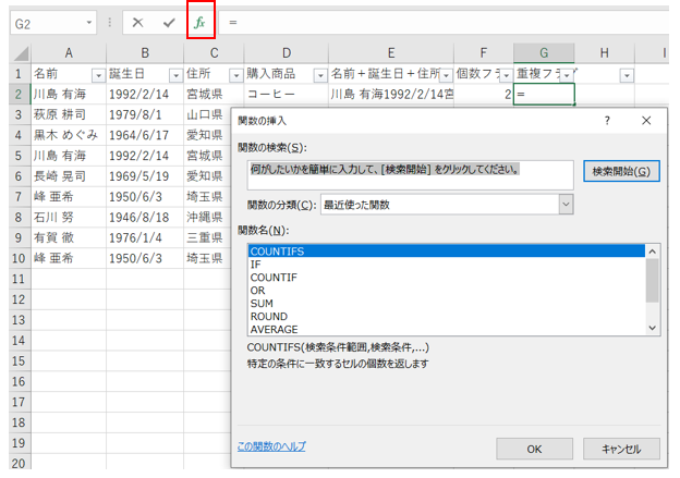 データの重複を調べるやり方で、一般的な方法は、COUNTIF関数を使うと単純に重複している数を調べることができます。COUNTIF関数だけだと、1つの列の中で重複しているかどうかを調べるだけになってしまいます。そこで、他の列の項目情報と組みあわせて、同一人物(同一商品等)が存在しない条件を作ることができれば、よりいっそう重複の精度があがります。名前&生年月日&住所が一致する同じ人物は2人としていないはずです。