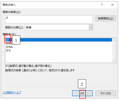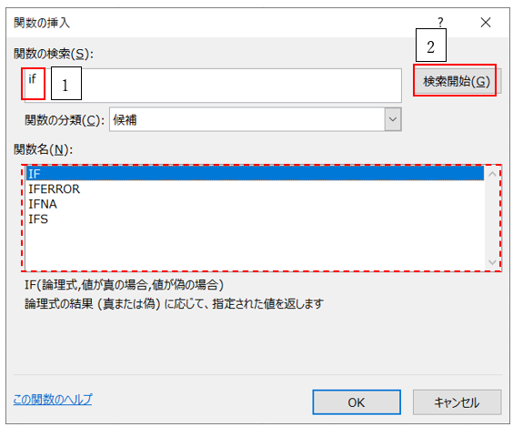 ‘③「関数の検索」ボックスに「if」と入力し「検索開始」をクリックします。