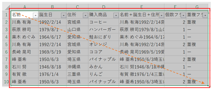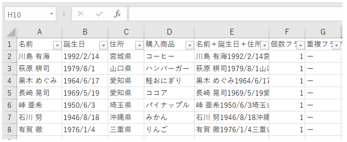 ‘【1】名前と生年月日と住所すべて一致したら重複カウント