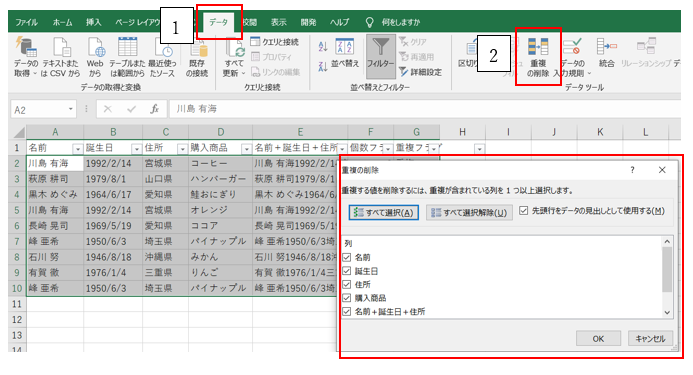 ‘②「データ」タブの「重複の削除」をクリックしてください。