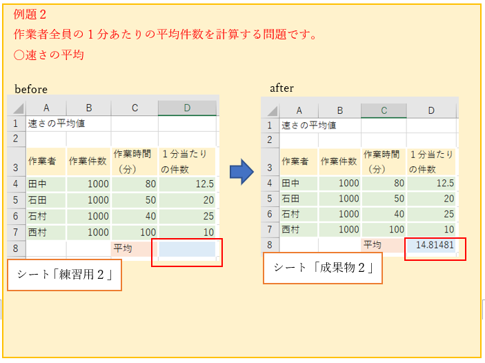 作業者全員の1分あたりの平均件数を計算する問題です。