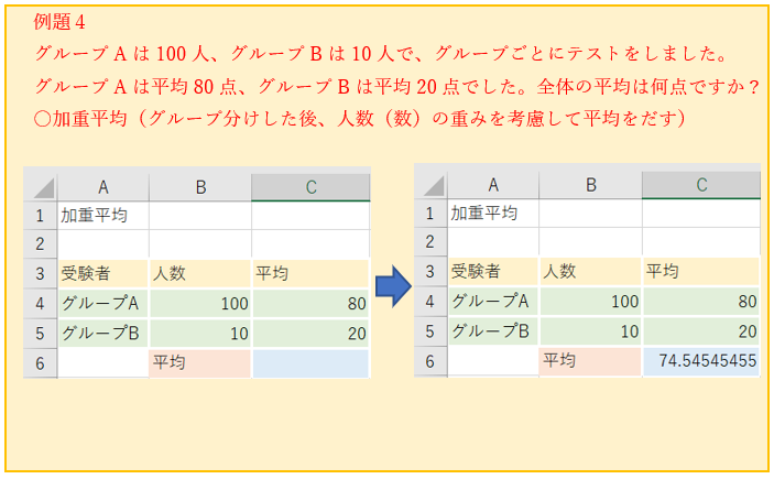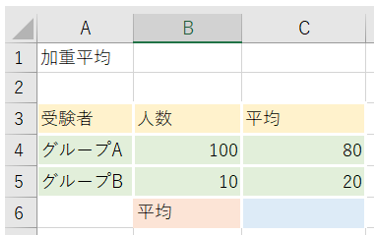 グループAとBでは、人数が異なります。それゆえ、AとBでの平均点の重みに差がでてしまいます。その為、数値の重みを考慮して平均点を計算する必要があります。