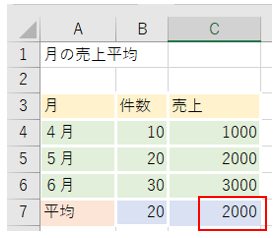 セルC7に数式「=AVERAGE(C4:C6)」を入力します。